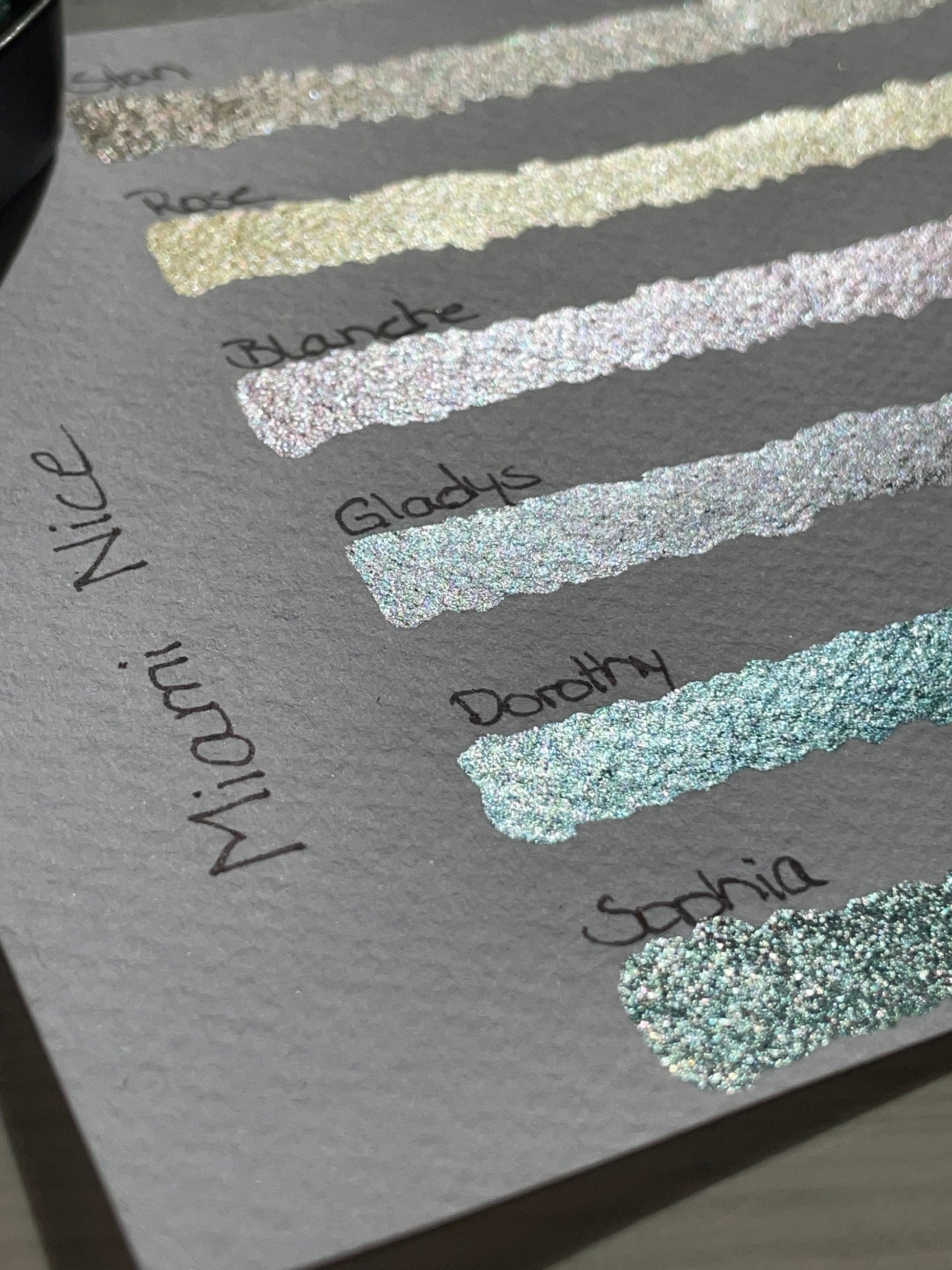 Blanche is a nice light pink glimmer paint with a silver shimmer. It is also part of the Miami Nice Set.