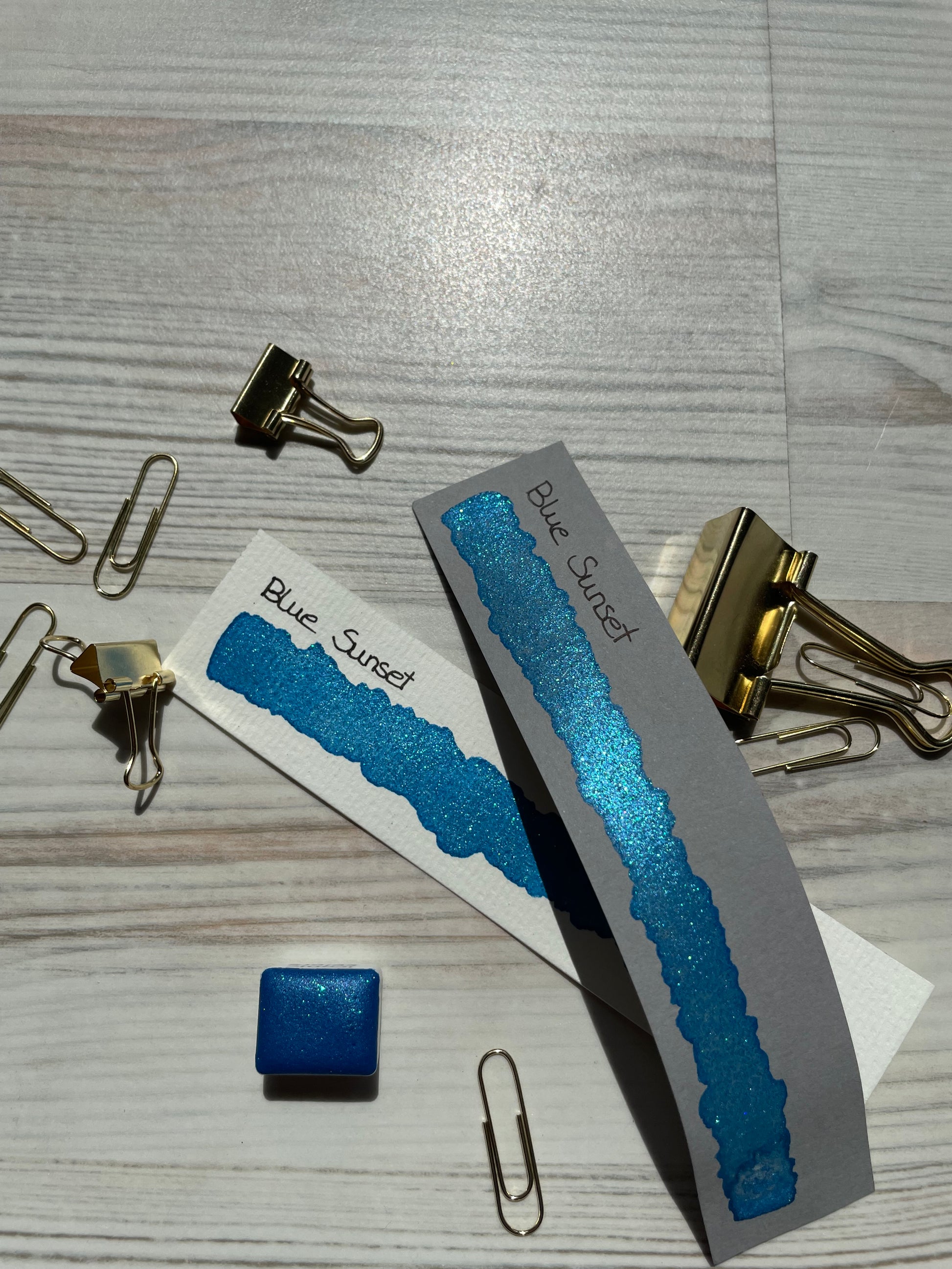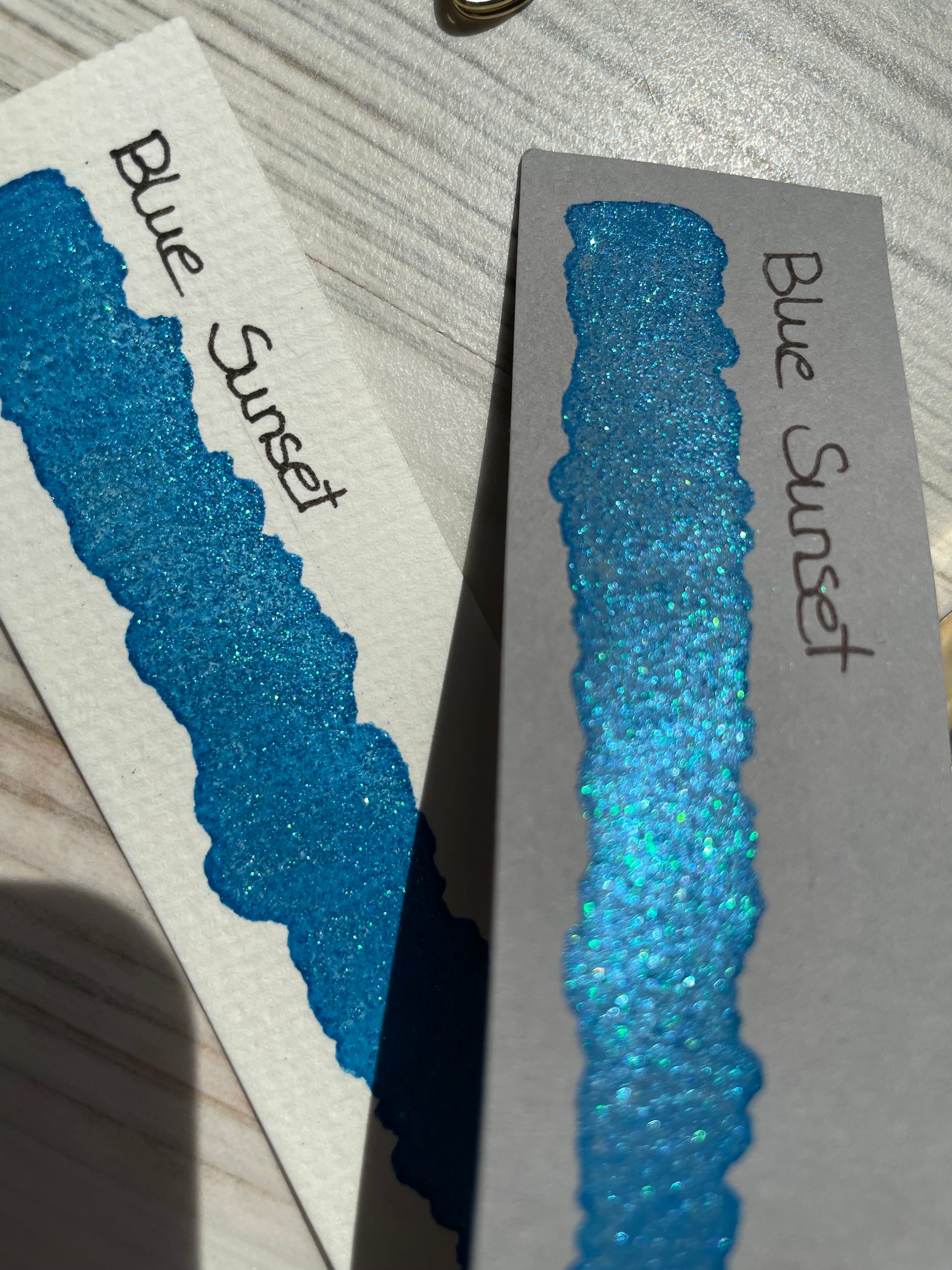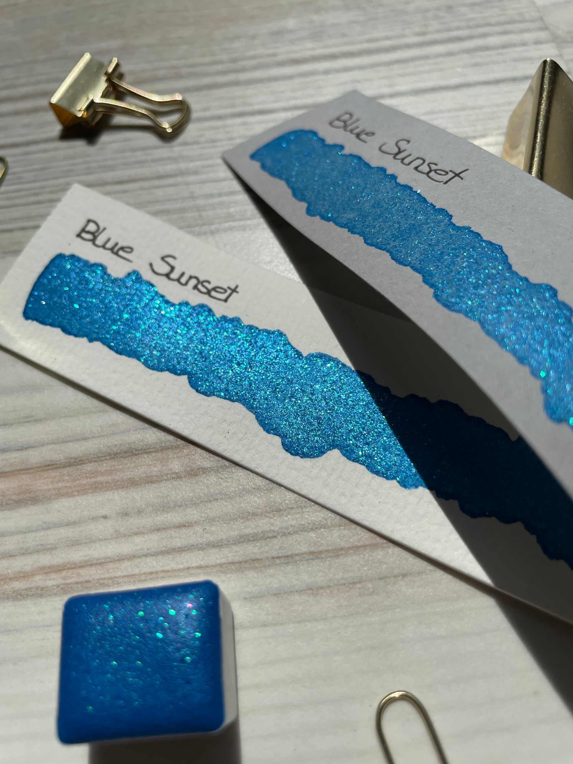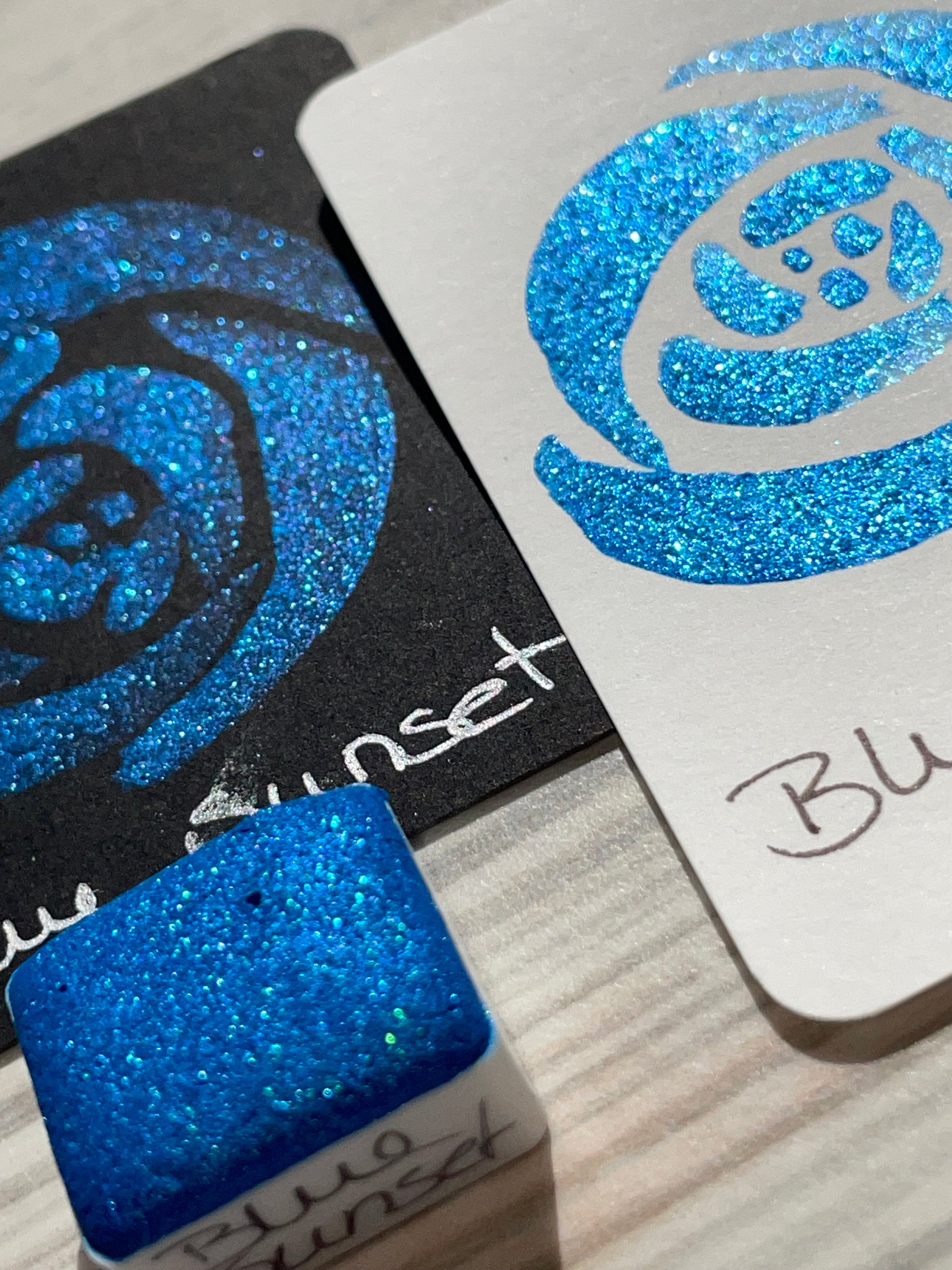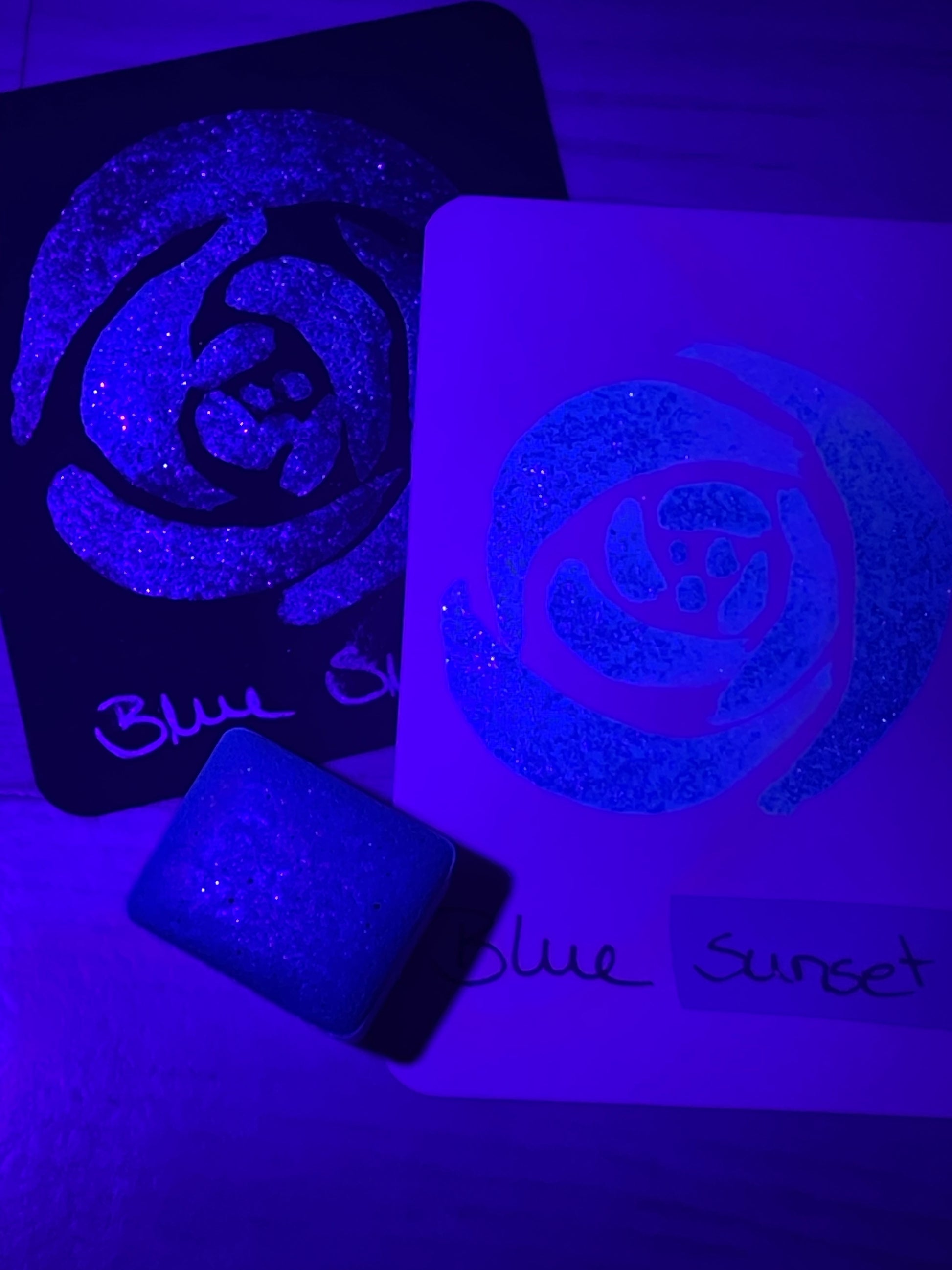 Blue Sunset is a glittery neon fluorescent paint with a shimmer. It is also part of the Smoothie set.