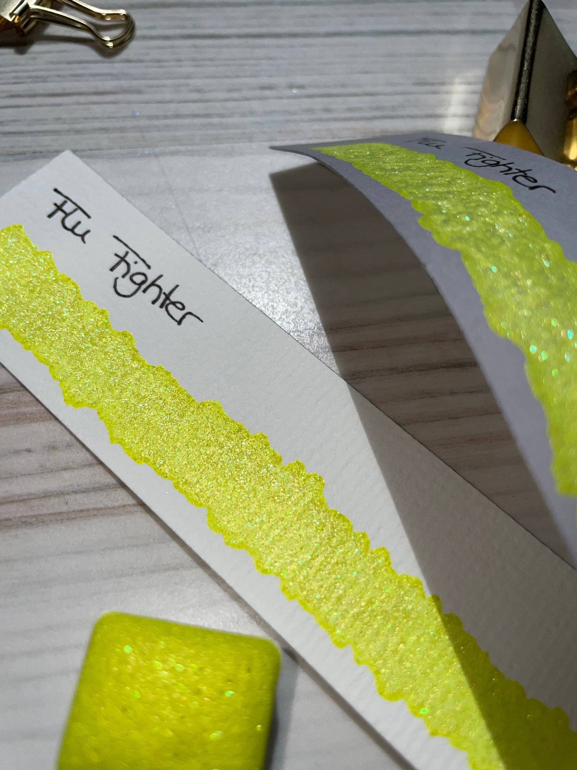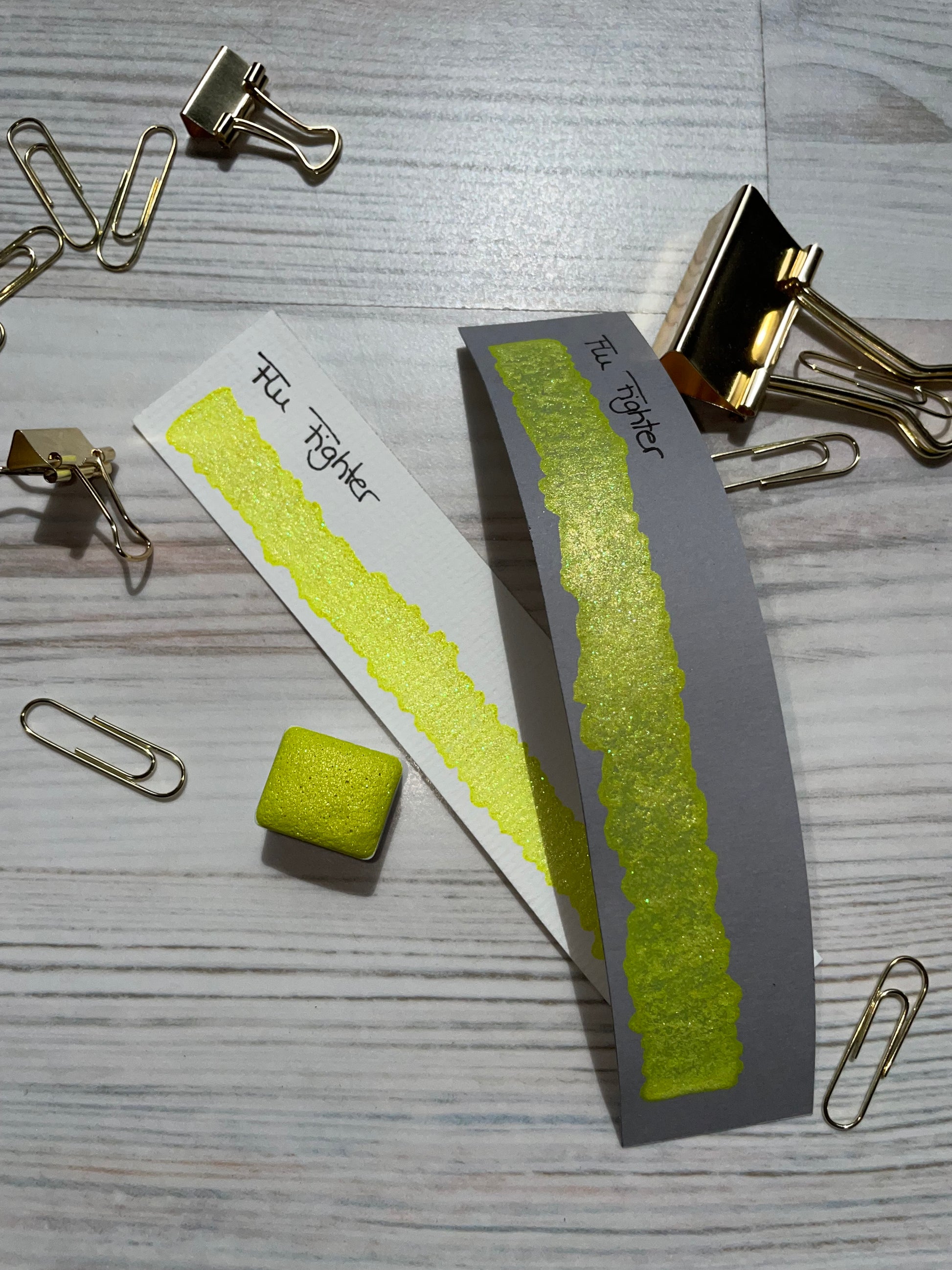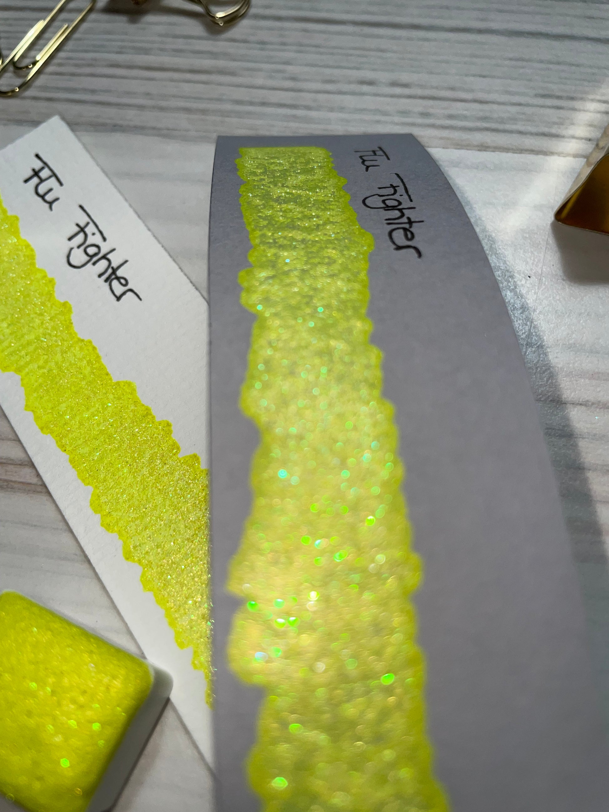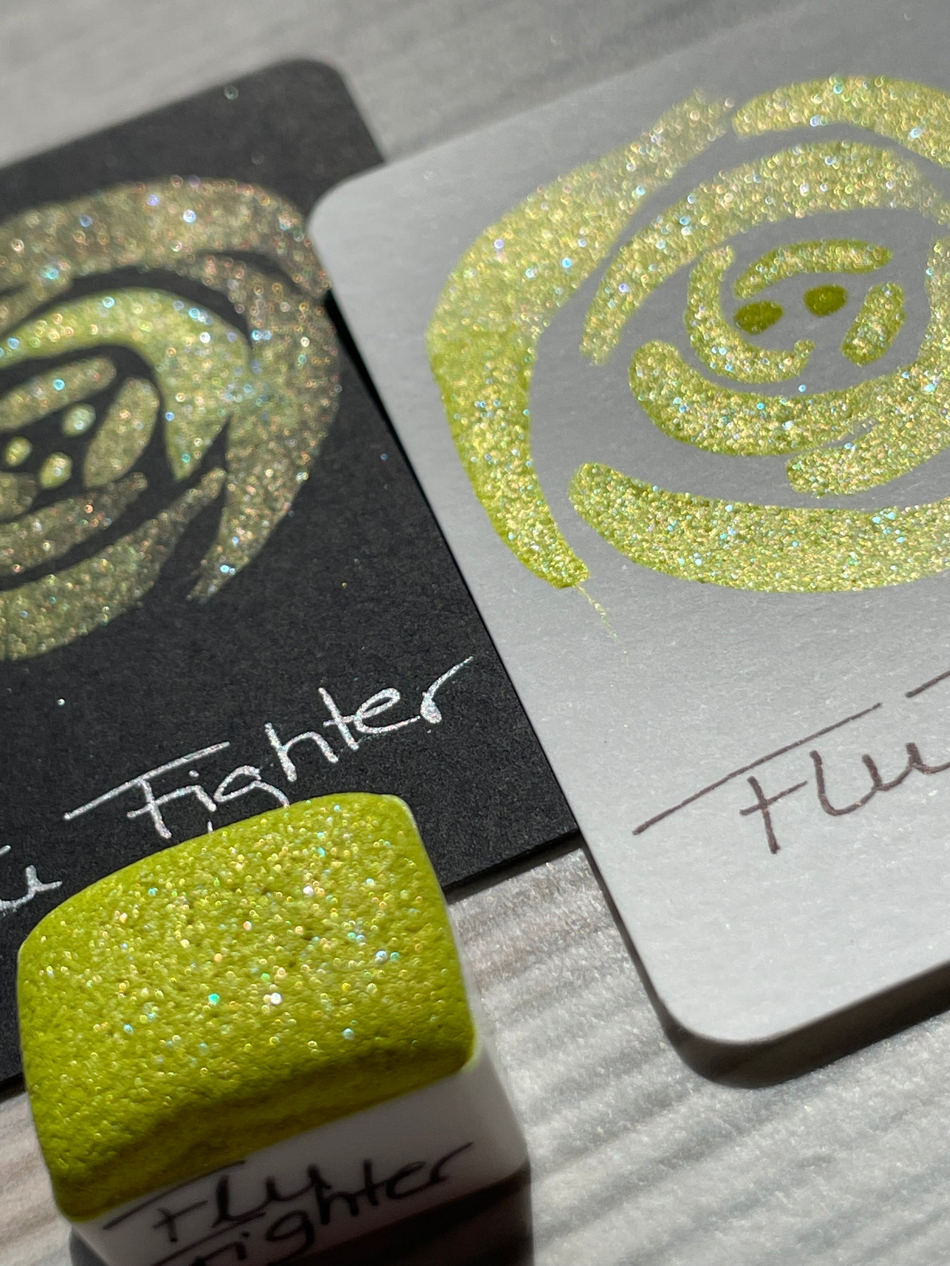 Flu Fighter is a glittery neon fluorescent paint with a shimmer. It is also part of the Smoothie set.