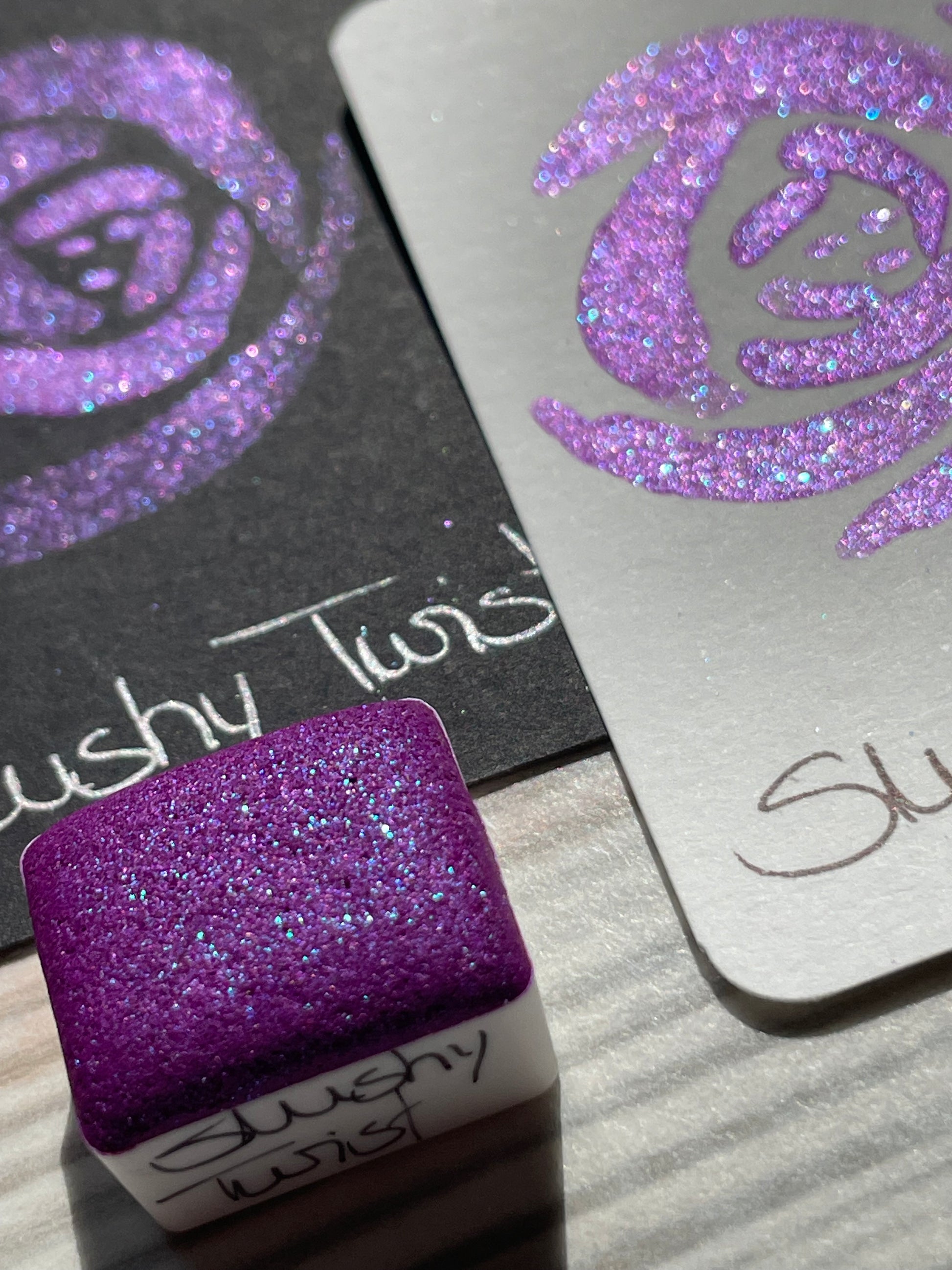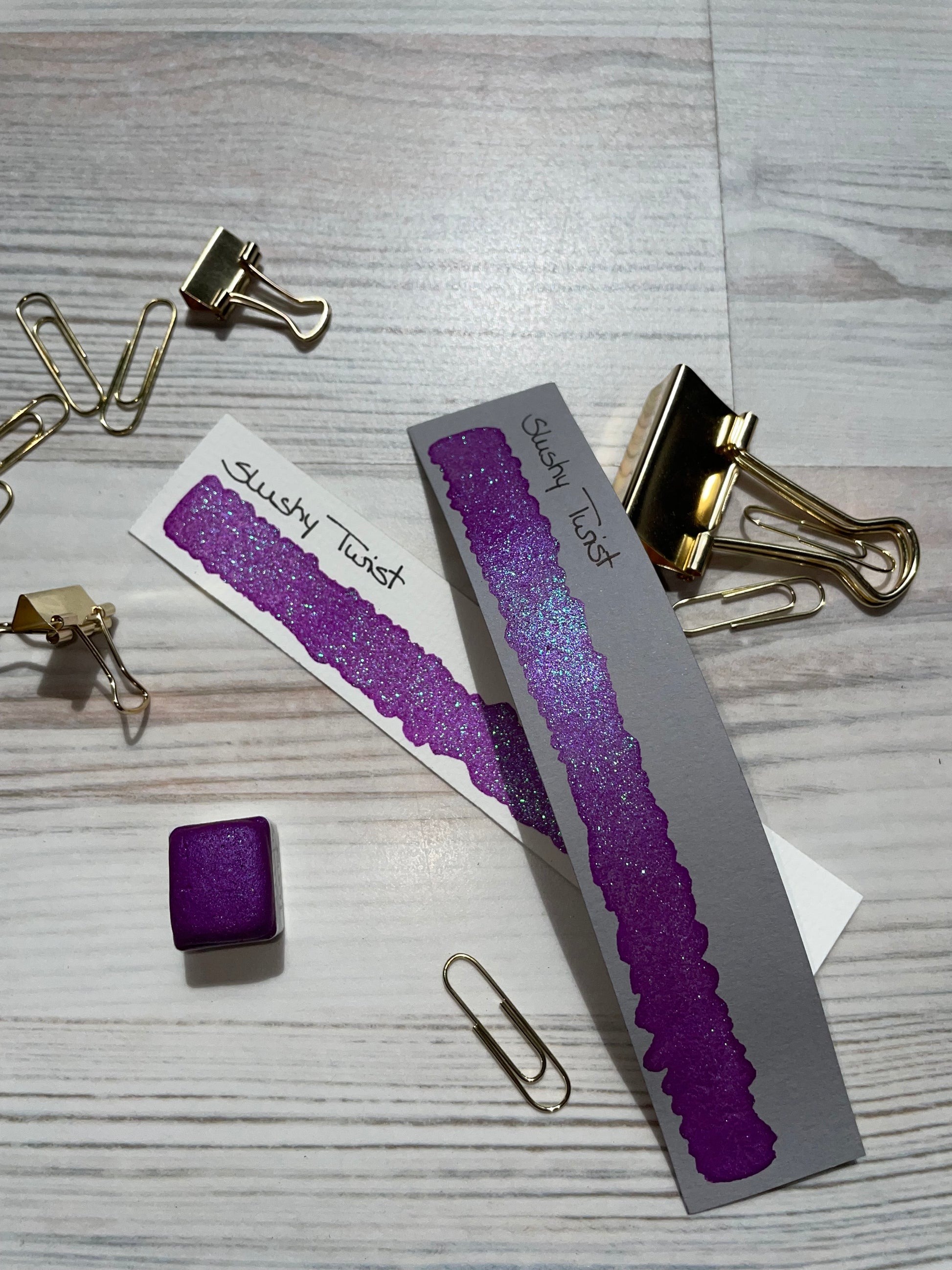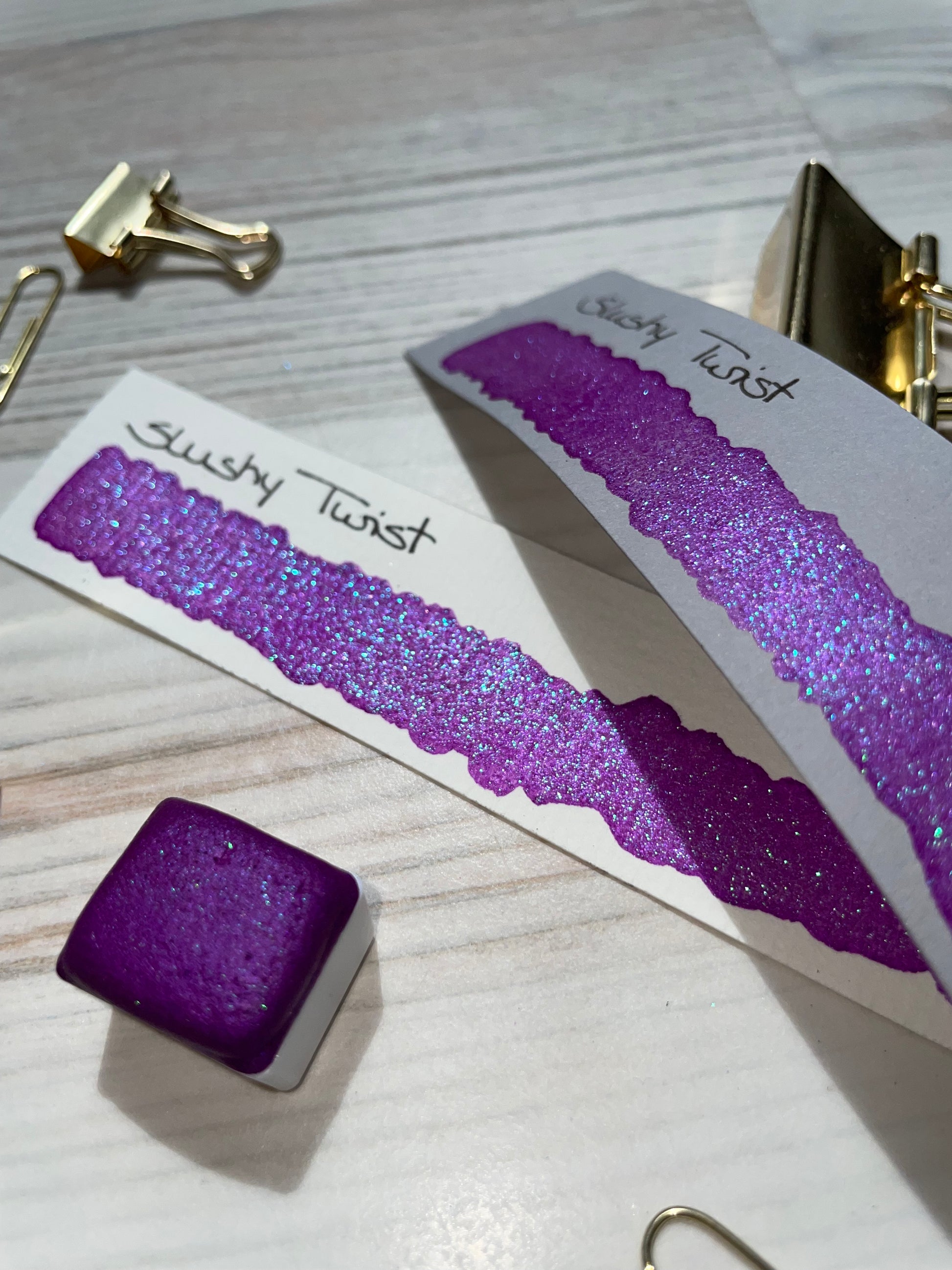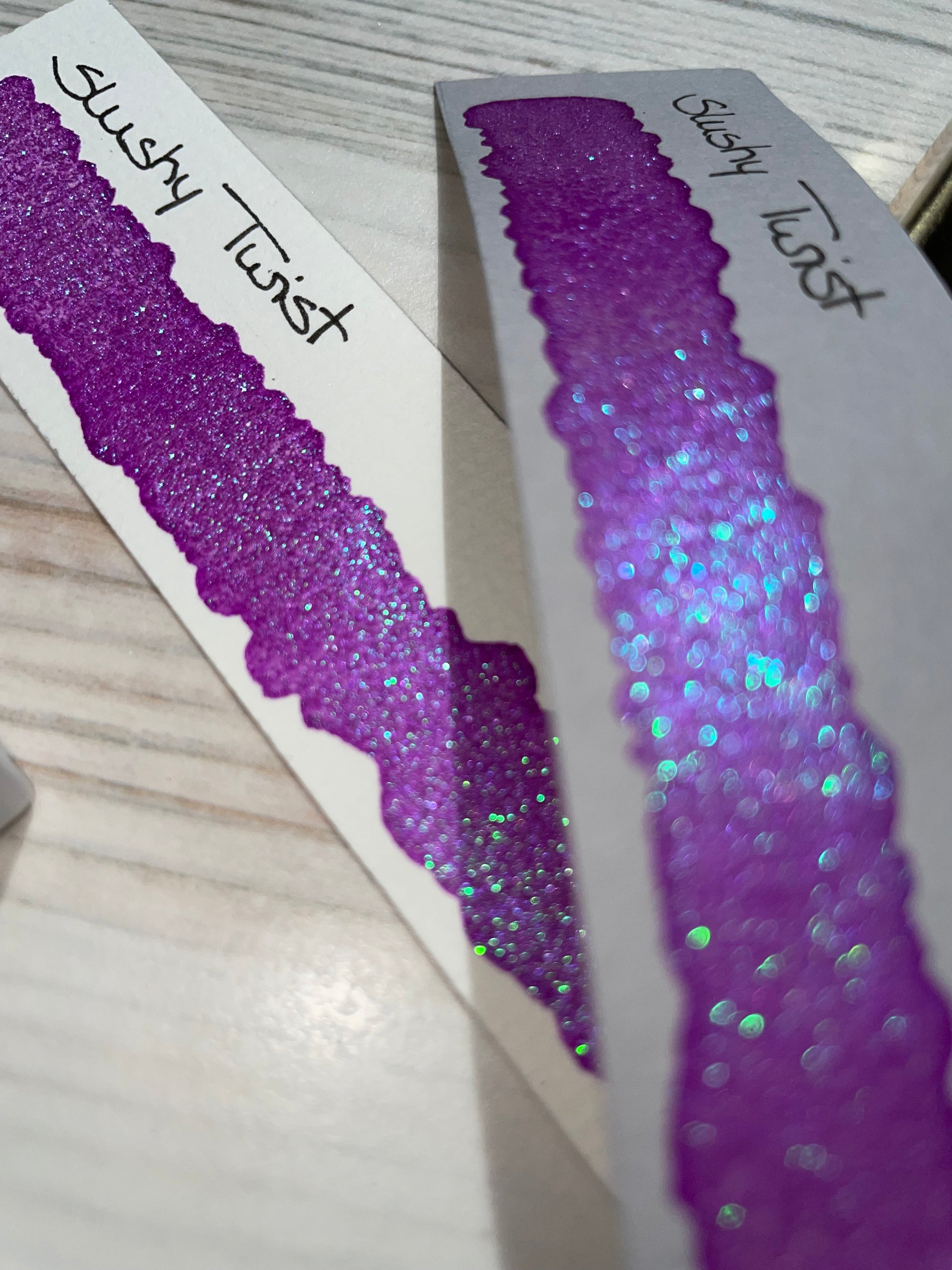 Slushy Twist is a glittery neon fluorescent paint with a shimmer. It is also part of the Smoothie set.